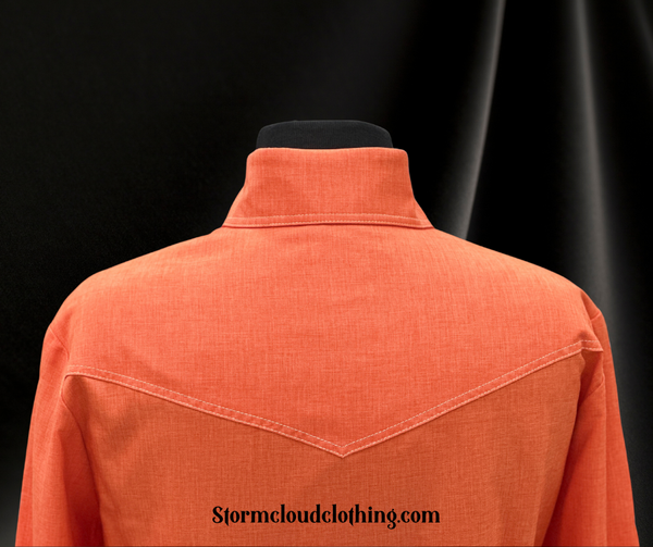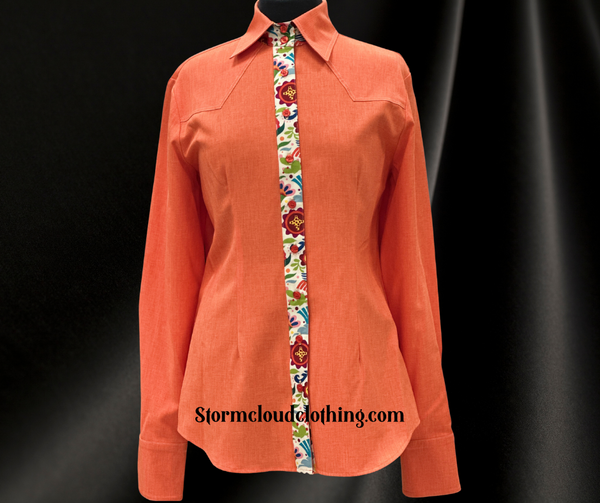 Orange SUNSATION fabric with fun fiesta trim. The front and back yokes are double top stiched in cream. Cuffs are double button.