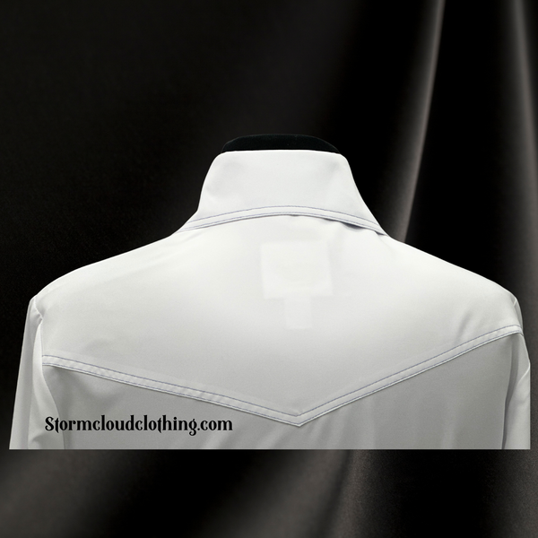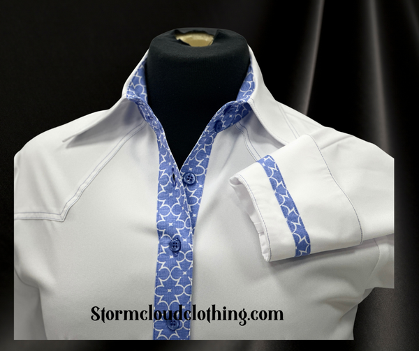 Crisp optic white SUNSATION with blue geometric trim. Blue double stitched top stitched front V yokes, back yoke and collar. Cuffs are double button with matching blue trim.